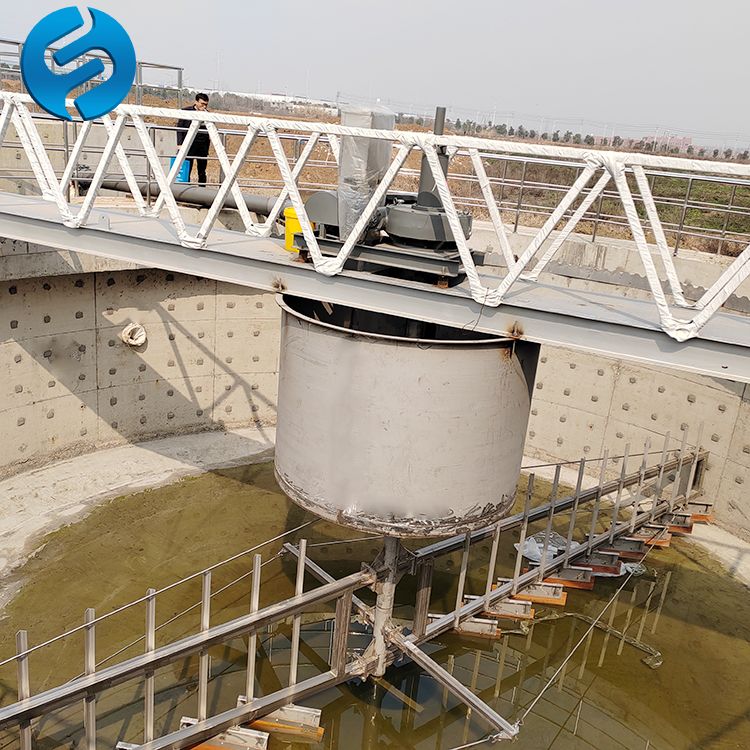 该设备采用中心传动、垂架式,污水进入周边配水槽内,经槽底配水孔均匀流入池内,并在周边挡水裙板的作用下,水流从池底流向中心,污泥依靠自重沉积于池底,从而形成污泥分离,驱动装置驱动中心竖架旋转,并带动刮臂及吸泥管旋转,在静水压力的作用下,污泥均匀地进入吸管上布置的吸口,然后通过中心排泥井的套筒阀排除池外,排泥量的大小可由套筒阀的升降度来控制,水面的浮渣通过撇渣装置撇向池边,再由刮渣耙刮进排渣斗内排出池外。